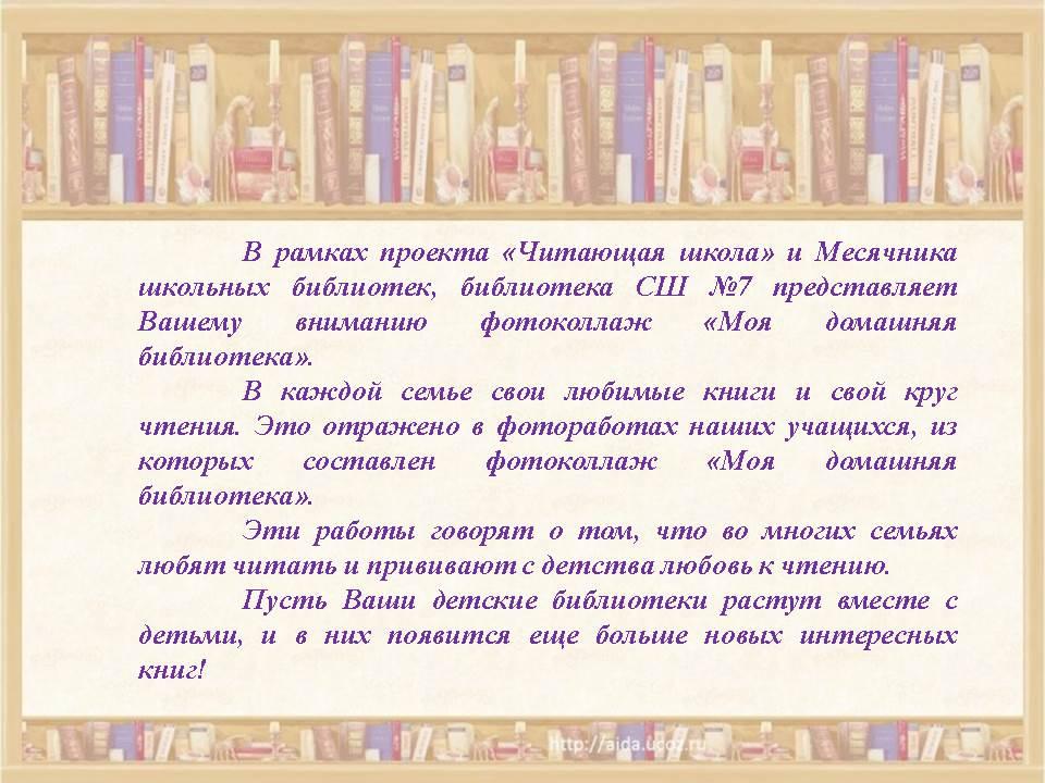 В рамках проекта «Читающая школа» и Месячника школьных библиотек, библиотека СШ №7 представляет Вашему вниманию фотоколлаж «Моя домашняя библиотека».