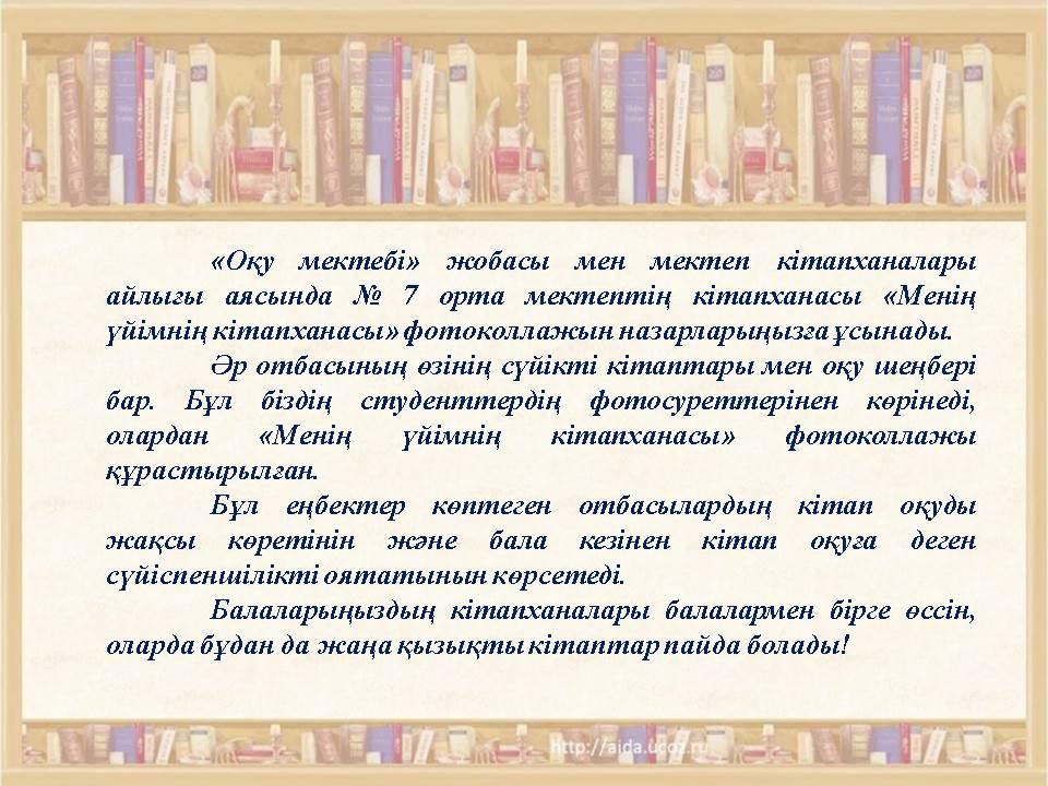 «Оқу мектебі» жобасы мен мектеп кітапханалары айлығы аясында № 7 орта мектептің кітапханасы «Менің үйімнің кітапханасы» фотоколлажын назарларыңызға ұсынады.