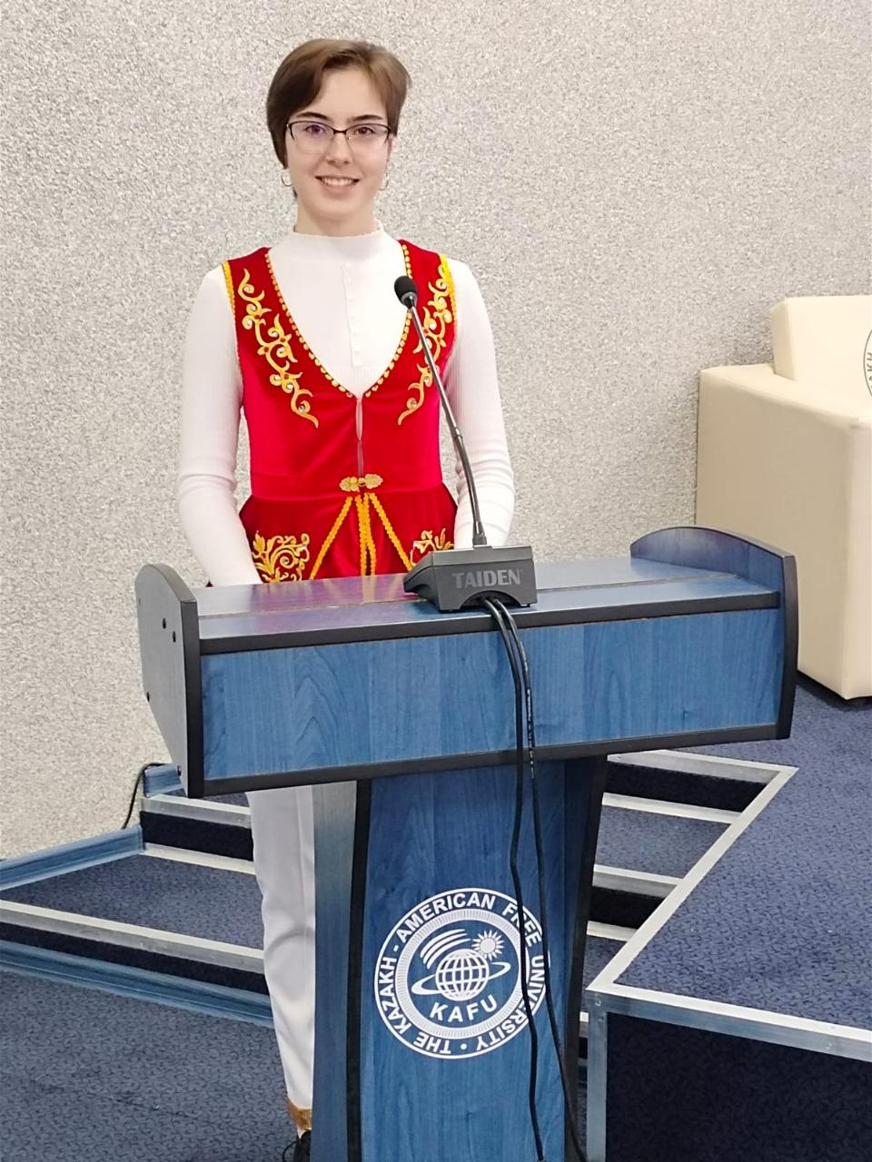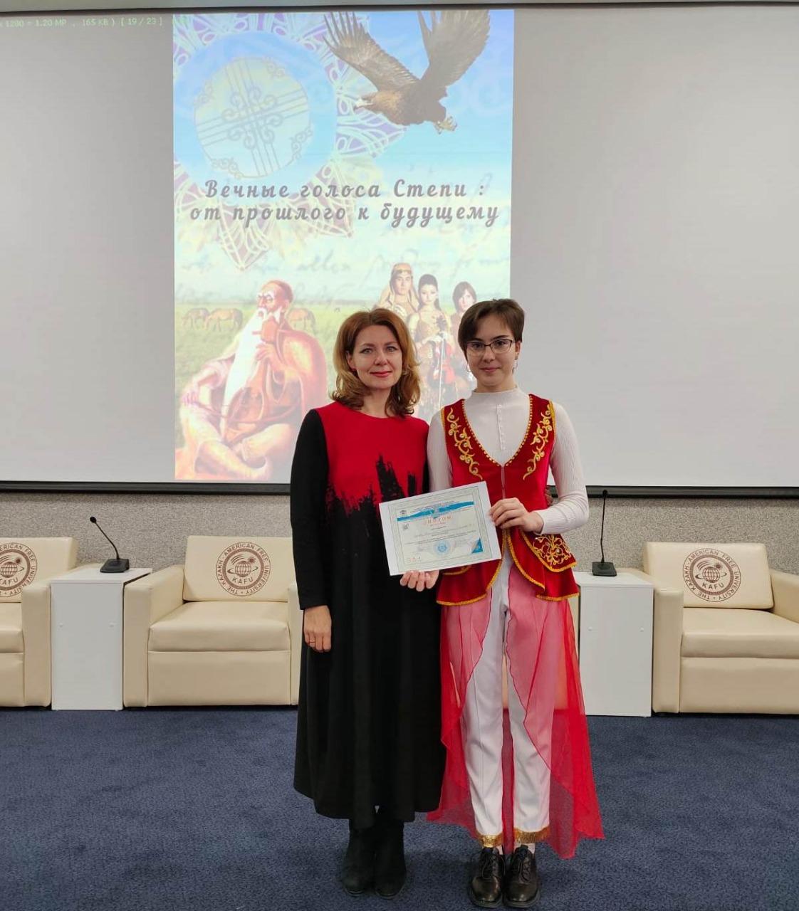 Ученица 10 «А» класса Суркова Анастасия совместно с Осиповой Татьяной Геннадьевной, учителем музыки, подготовили и представили итог своей работы, постер «Вечные голоса Степи: от прошлого к будущему», в котором раскрыли вопрос о богатстве казахского духовного наследия и его сохранения. Блестящее выступление Насти было оценено жюри по достоинству. Итог – 1 место! Поздравляем победителя!