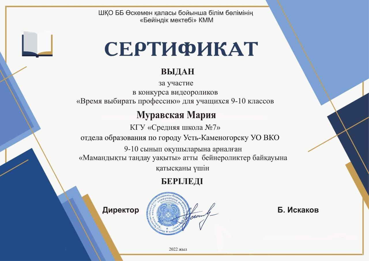 2022 жылғы 25 қараша мен 9 желтоқсан аралығында ШҚО Өскемен қаласы білім бөлімінің «Бейіндік мектеп» КММ 9-10 сынып оқушыларына арналған «Мамандықты таңдау уақыты» қалалық кәсіптік бағдарлау бейнероликтер байқауын өткізді. Бұл шараға мектебімізден 10 «Б» сынып оқушысы Мария Муравская (жетекшісі Филипова Евгения Борисовна) қатысты.