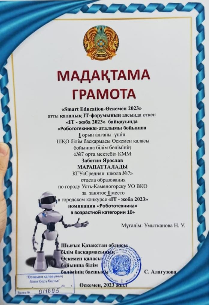Қалалық «IT жоба 2023» байқауында «Робототехника» номинациясы бойынша 8 «Б» сынып оқушысы Заботин Ярослав құрметті 1 орынды иеленді.