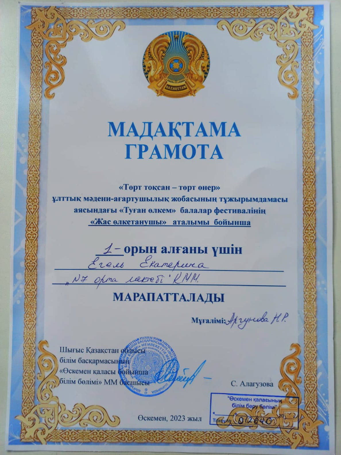 2023 жылғы 12 мамырда "Төрттен тоқсан-төрттен өнер" ұлттық мәдени – ағарту жобасының Тұжырымдамасы аясында "Туған өлкем" қалалық балалар фестивалі өтті. Ондаған оқушылар өз жұмыстарын әртүрлі номинациялар бойынша ұсынды. "Жас өлкетанушы" фестивалі номинациясында 6 "Г" сынып оқушысы Егель Екатерина өзінің "Менің туған өлкем, Шығыс Қазақстан"атты авторлық өлеңімен сөз сөйледі. Бұл номинацияда Катя жеңіске жетіп, құрметті 1 орынға ие болды. Жетекшісі: орыс тілі мен әдебиеті пәнінің мұғалімі Аргунова Н.Р.