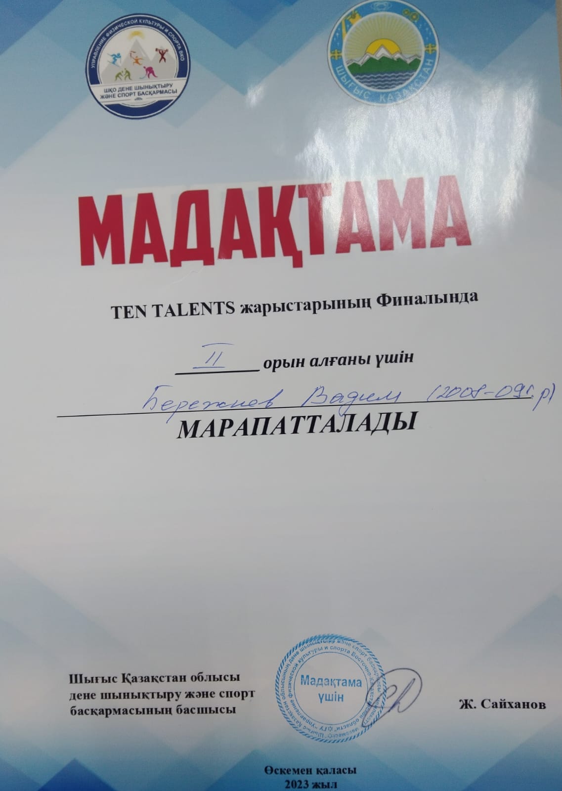 2023 жылдың 15 мамырында TEN TALENTS 2008-2009 жылы туған жасөспірімдер арасындағы жеңіл атлетикадан облыстық жарыстың финалдық кезеңі өтті. Біздің мектепті 8 "В" сыныбының оқушысы Бережнов Вадим лайықты түрде таныстырды, ол 285 см белгісін еңсеріп, биіктікке секіруде күміс жеңіп алды; сондай-ақ көпсайыста үшінші орынды жеңіп алды: 60 м жүгіру, биіктікке және ұзындыққа секіру. Вадим медальмен, грамоталармен және ақшалай сертификатпен марапатталды. Біздің спортшымызды және оның дене шынықтыру мұғалімі Рашид Калиевич Амиргалиевті табысты өнер көрсетуімен құттықтаймыз және одан әрі табыс тілейміз!