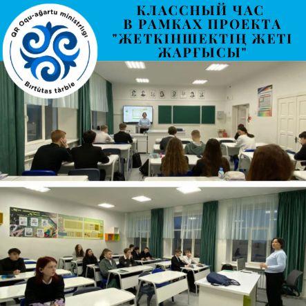 В рамках реализации проекта "Жеткіншектің жеті жарғысы" проведены классные часы по формированию нравственных качеств личности. Чтобы жить в мире? людям надо научиться жить решая проблемы и задачи на основе сотрудничества. Этому способствуют такие человеческие качества: взаимопонимание, взаимоуважение, ответственность, доброжелательность, сдержанность, уступчивость, терпимость.