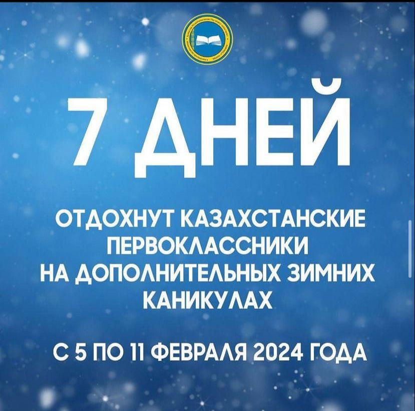 Құрметті ата-аналар! 5 ақпан мен 11 ақпан арасында бірінші сынып оқушылары үшін қосымша демалыстар өткізіледі. /Уважаемые родители! С 5 по 11 февраля включительно для учащихся первых классов пройдут дополнительные каникулы.