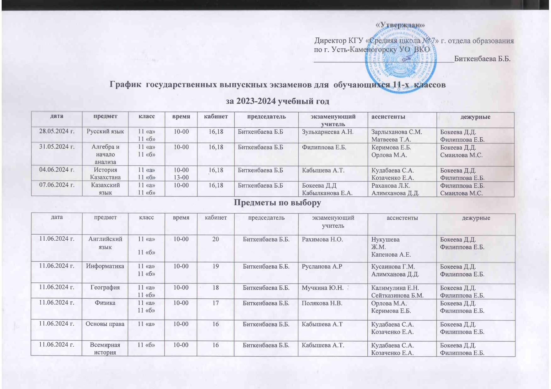 График государственных выпускных экзаменов для обучающихся 11 классом за 2023 - 2024 учебный год » №7 орта мектебі
