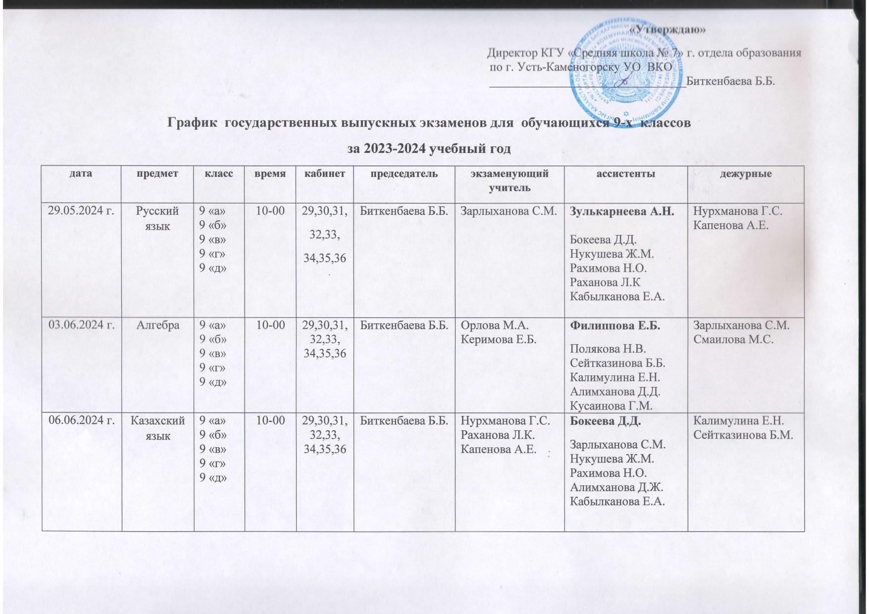 График государственных выпускных экзаменов для обучающихся 9 классом за 2023 - 2024 учебный год » №7 орта мектебі