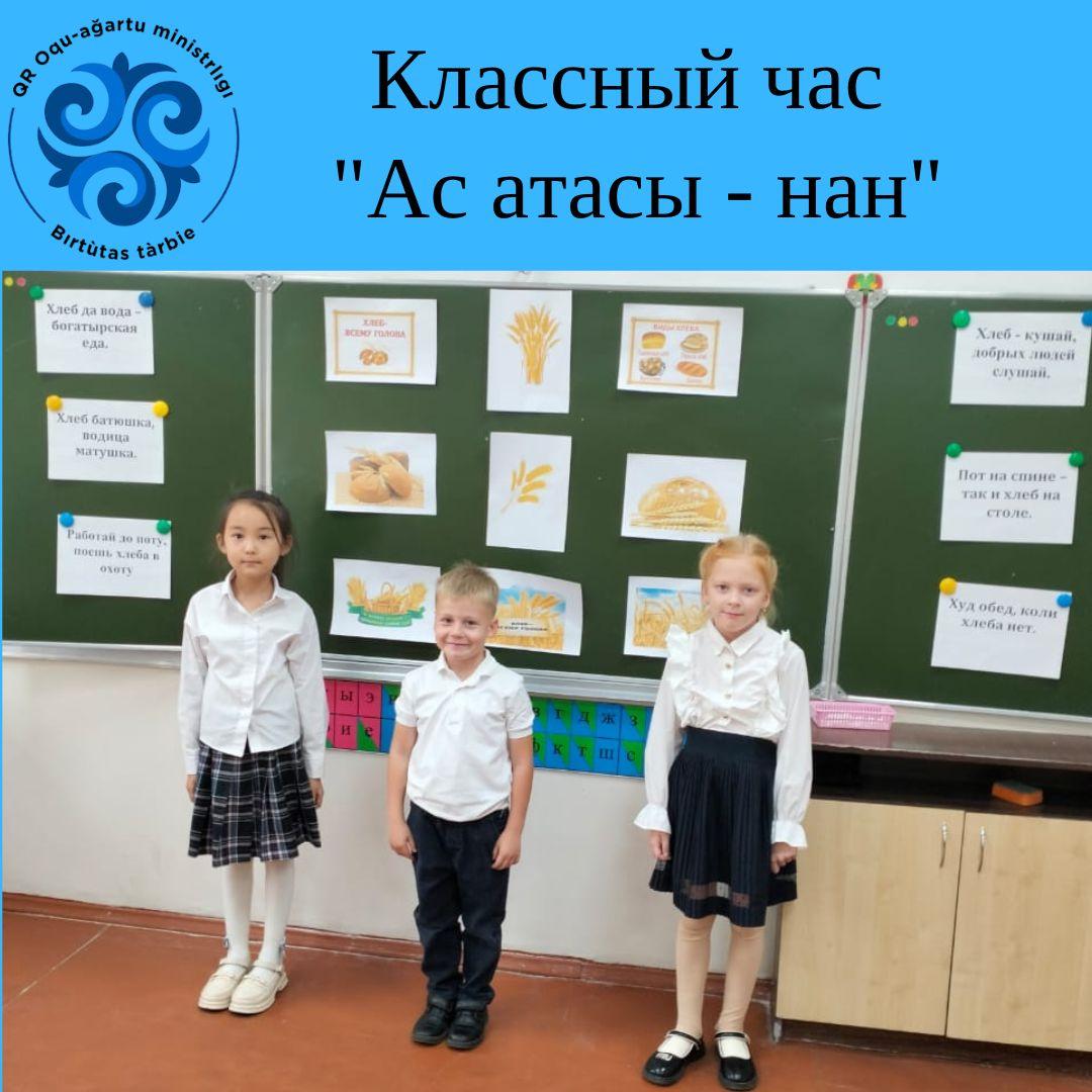 16 октября отмечается Всемирный день хлеба. Хлеб - символ жизни, здоровья и благополучия человека. Он выделяется среди остальных продуктов, всегда ставится во главе стола, считается кормильцем. С целью формирования бережного и уважительного отношения к хлебу в школе проведены классные часы на тему "Ас атасы - нан".