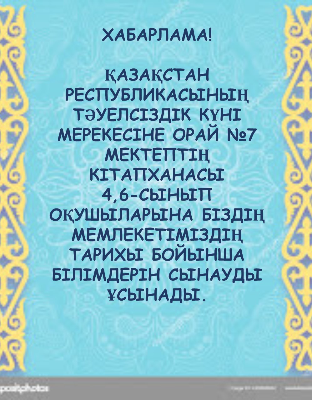 Қазақстан Республикасының Тәуелсіздік күні мерекесіне орай №7 мектептің кітапханасы 4,6-сынып оқушыларына біздің мемлекетіміздің тарихы бойынша білімдерін сынауды ұсынады.