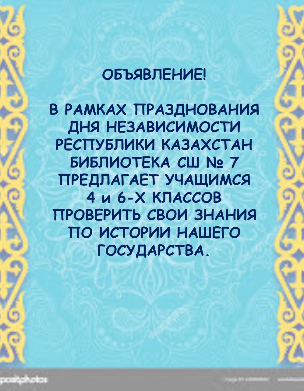 В рамках празднования Дня Независимости Республики Казахстан библиотека сш № 7 предлагает учащимся 4 и 6-х классов проверить свои знания по истории нашего государства.