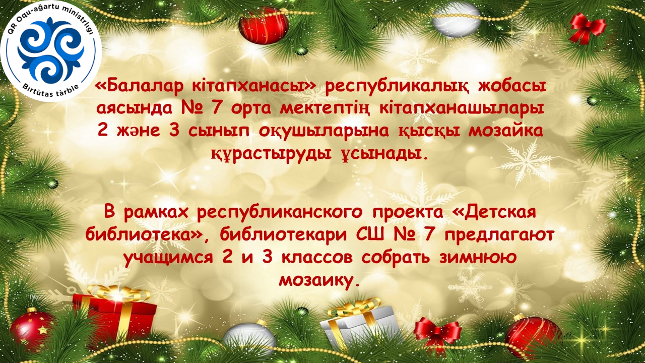 «Балалар кітапханасы» республикалық жобасы аясында № 7 орта мектептің кітапханашылары 2 және 3 сынып оқушыларына қысқы мозайка құрастыруды ұсынады.