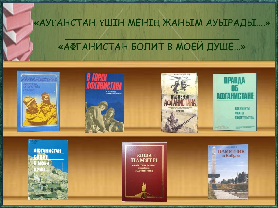 № 7 орта мектептің кітапханашылары оқушыларды Ауғанстаннан келген әскерлердің шығарылуына арналған «Ауғанстан үшін менің жаным ауырады ...» атты электронды кітап көрмесімен таныстырды. Көрме патриоттық тәрбие , рух, батылдық, ержүректілік, Отаннан тыс қызметтік міндеттерді орындаған интернационалист жауынгерлердің естелігіне бағытталған.