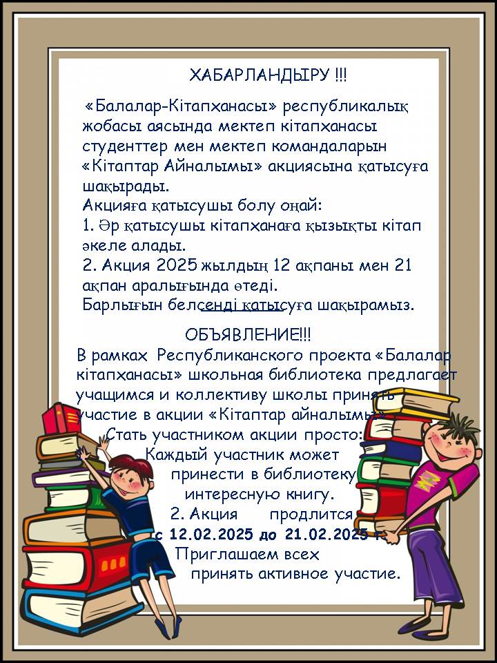 В рамках Республиканского проекта «Балалар кітапханасы» школьная библиотека предлагает учащимся и коллективу школы принять участие в акции «Кітаптар айналымы»