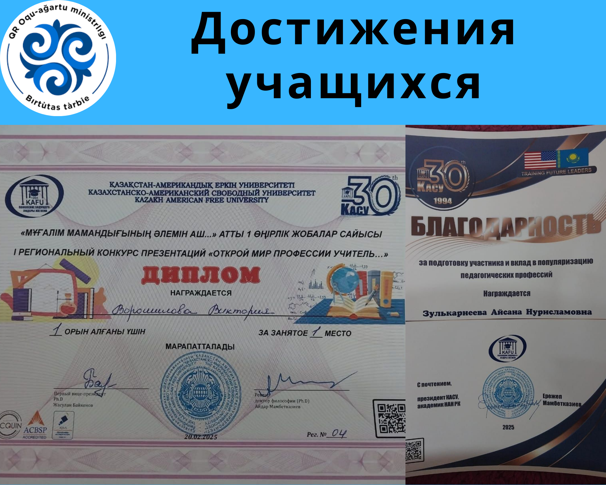 Мы поздравляем ученицу 11 класса Ворошилову Викторию! Виктория заняла почётное 1 место в 1 Региональном конкурсе презентациий "Открой мир профессий учитель ". Данный конкурс проводил Казахстанско-Американский свободный университет.