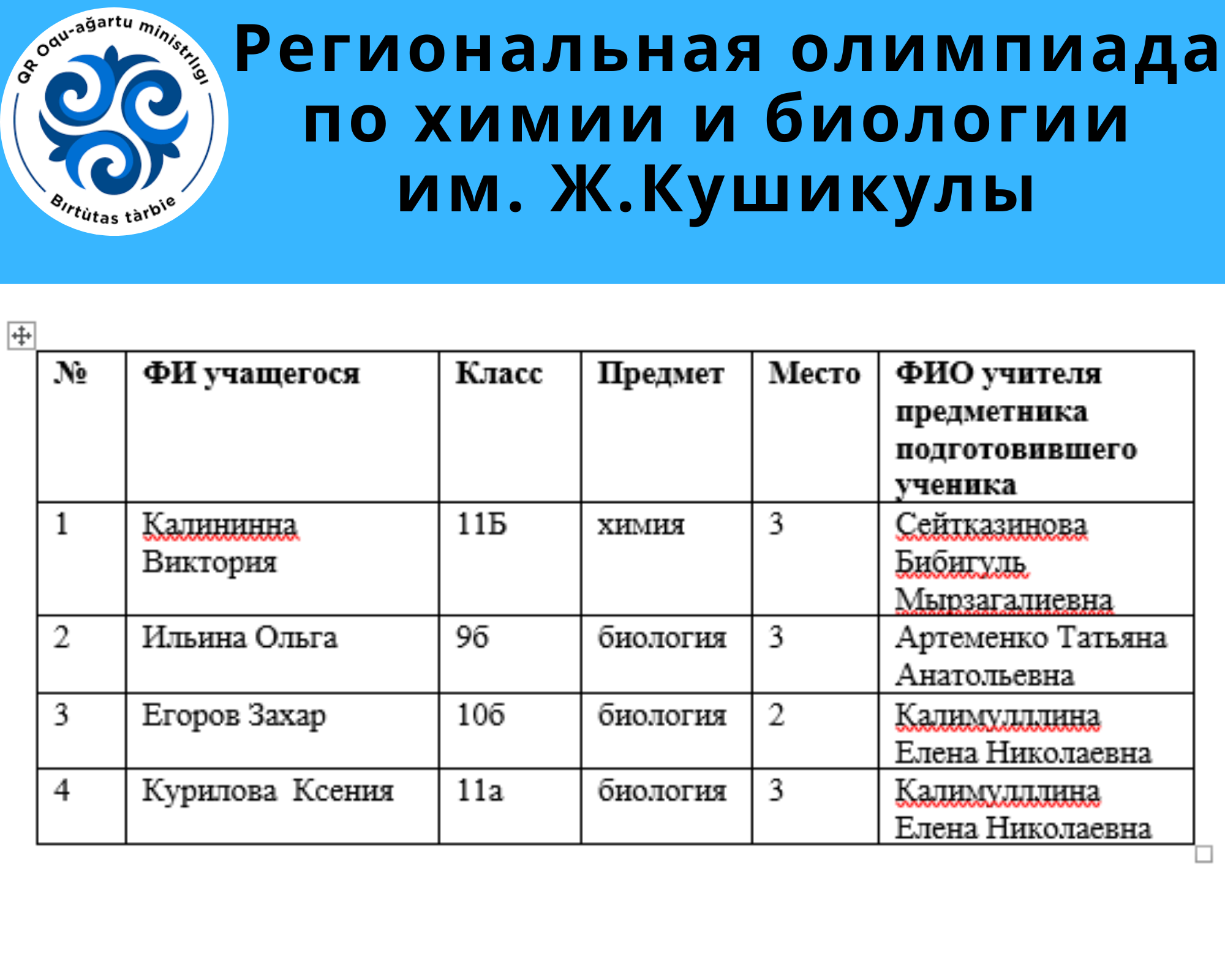 По итогам Региональной олимпиады по химии и биологии им. Ж.Кушикулы наши ученик заняли почетные места. Мы поздравляем наших учеников и их руководителей.
