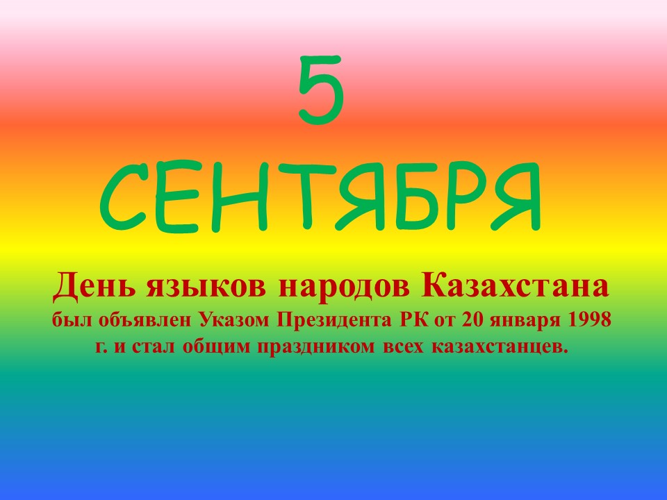 5 сентября В Казахстане отмечается День языков народов Казахстана. Этот праздник символизирует единство и уважение к языкам и культурам всех этносов, проживающих в стране.