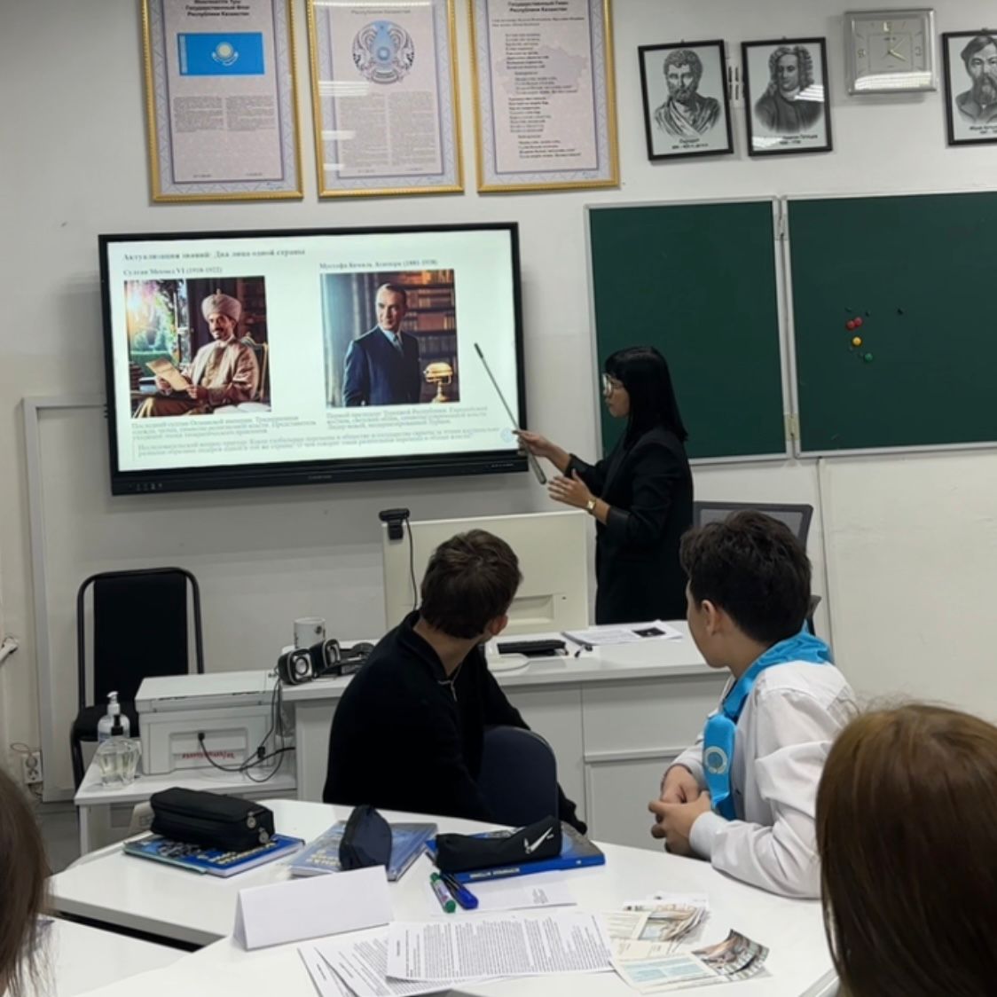 Тарих пәні мұғалімі Қабышева А.Т. 8 «Б» сыныбында «Неліктен Мұстафа Кемалды “Ататүрік” деп атаған?» тақырыбында ашық сабақ өткізді. Сабақта цифрлық құралдар мен жасанды интеллект элементтері қолданылып, оқушылардың тарихи материалды терең түсінуіне мүмкіндік жасалды. Оқушылар өз бетімен мазмұнды постерлер дайындап, Ататүріктің реформалары мен тарихи рөлін көрнекі түрде көрсетті.