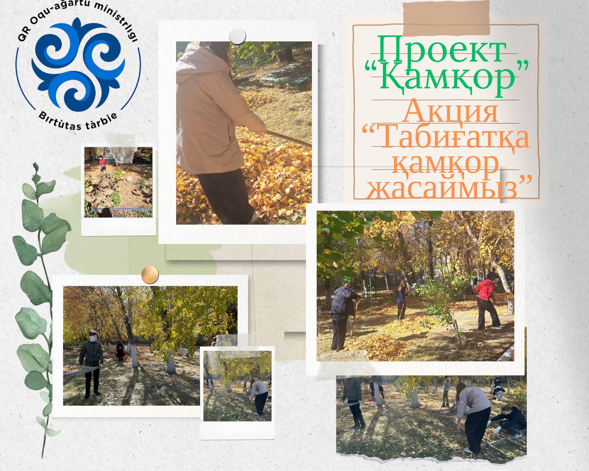 "Біртұтас тәрбие" бірыңғай тәрбие бағдарламасының "Қамқор" жобасы шеңберінде мектеп аумақтарын құлаған жапырақтардан және кептірілген шөптерден тазарту бойынша "Табиғатқа қамқорлық жасаймыз" акциясы өткізілді.