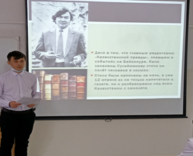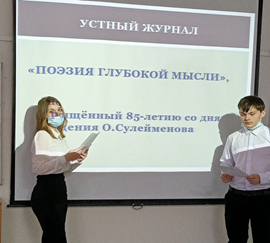 Для учащихся 10-х классов был проведён устный журнал «Поэзия глубокой мысли»,     посвящённый 85-летию со дня рождения О.Сулейменова (ответственный учитель Зарлыханова С.М.). Учащиеся подготовили информацию о жизни, творчестве и общественной деятельности казахстанского поэта. Устный журнал включал в себя просмотр  видеоролика «Олжасу Сулейменову- 85 лет». Также звучали стихи О.Сулейменова с экрана и в исполнении учащихся.