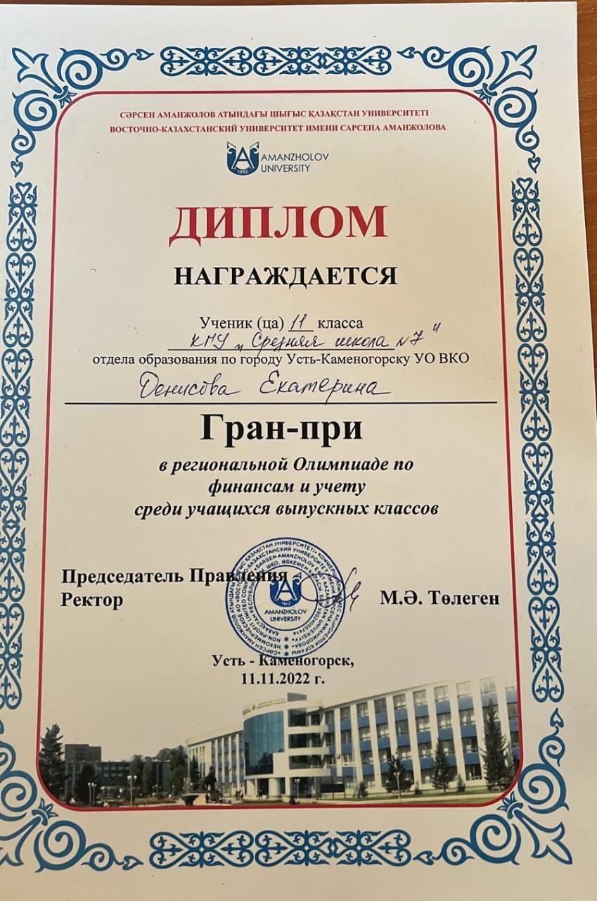 Сегодня 11 ноября текущего года Восточно-Казахстанский Университет имени С. Аманжолова проводил региональную Олимпиаду по финансам и учету для выпускных классов. В данной олимпиаде наша ученица 11 «Б» класса Денисова Екатерина заняла почетное место Гран при и была награждена дипломом за победу в номинации «Лучший научный проект» и «Лучшее эссе».
