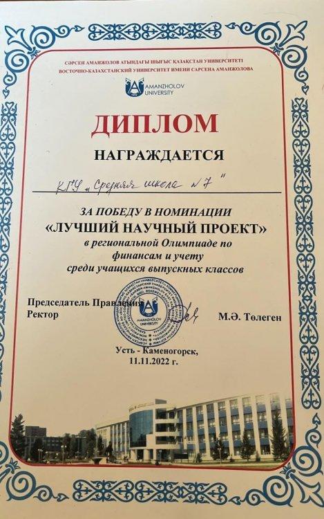 Бүгін, ағымдағы жылдың 11 қарашасында С.Аманжолов атындағы Шығыс Қазақстан университетінде бітіруші курстар арасында қаржы және есеп пәнінен облыстық олимпиада өтті. Бұл олимпиадада 11 «Б» сынып оқушысы Денисова Екатерина Гран-при жүлдесін иеленіп, «Үздік ғылыми жоба» және «Үздік эссе» номинацияларын жеңіп алғаны үшін дипломмен марапатталды.
