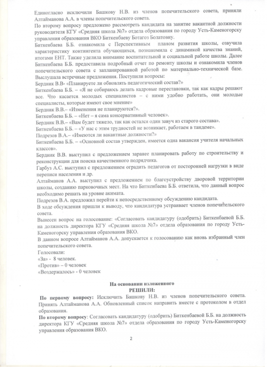 №7 орта мектебі » Ашық орган » Қамқоршылық кеңес » 11.10.2021. Протокольное решение по итогам собеседования с кандидатами на занятие вакантной должности рукводителя организации