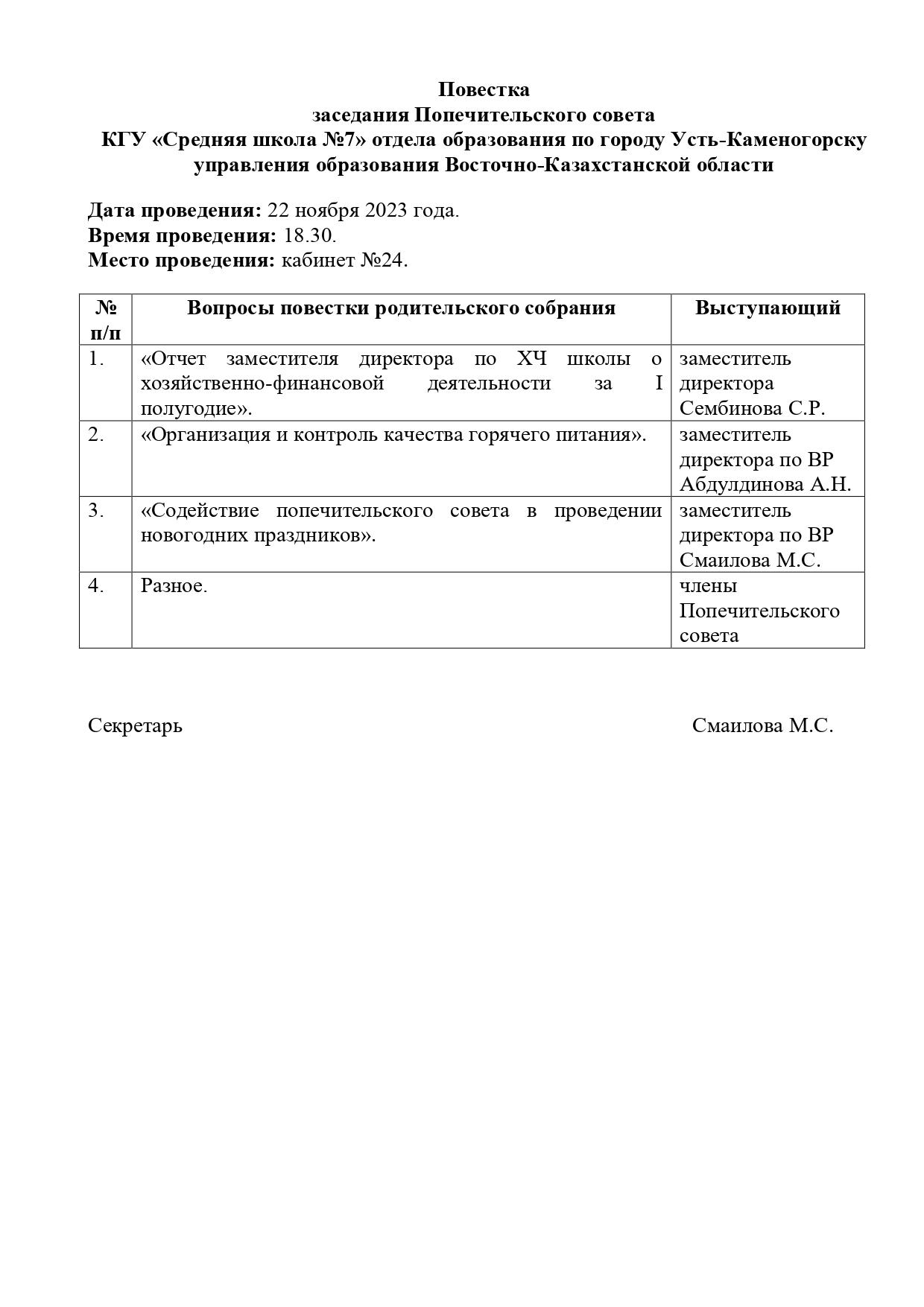 №7 орта мектебі » Ашық орган » Қамқоршылық кеңес » Повестка заседания Попечительского совета КГУ «Средняя школа №7» отдела образования по городу Усть-Каменогорску управления образования Восточно-Казахстанской области