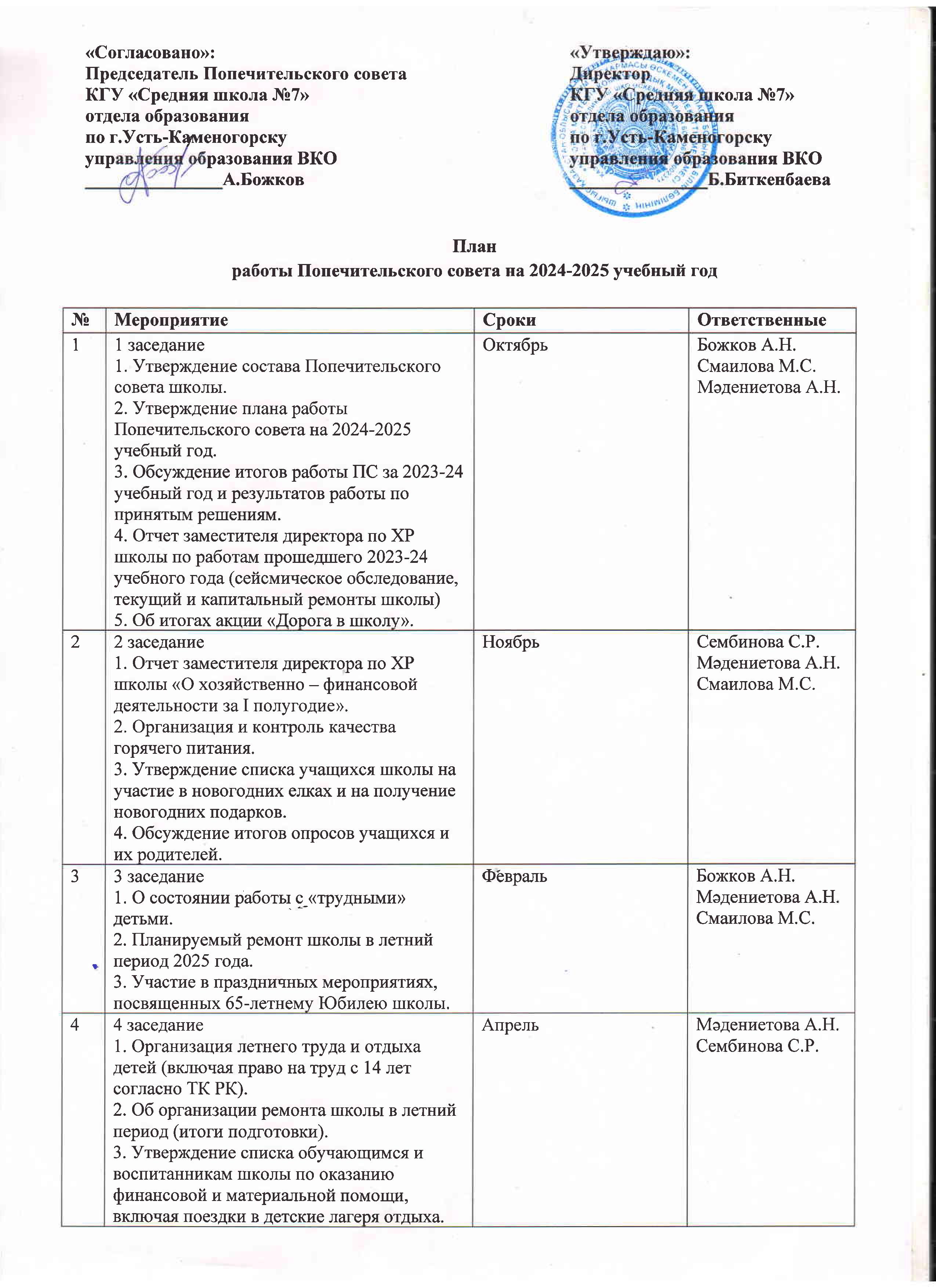 План Попечительского совета на 2024-2025 учебный год » №7 орта мектебі
