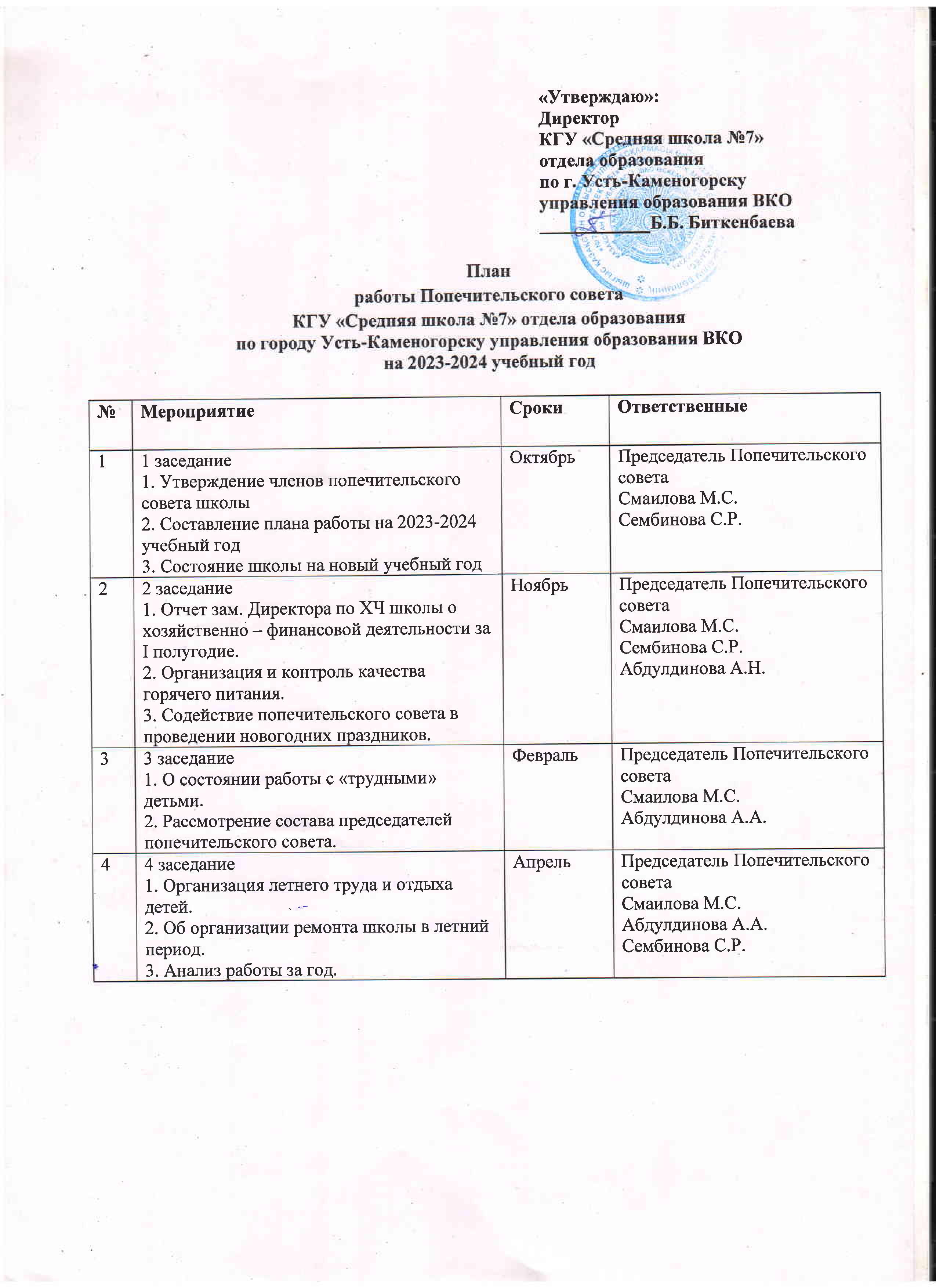 План заседание Попечительского совета на 2023-2024 учебный год » №7 орта мектебі