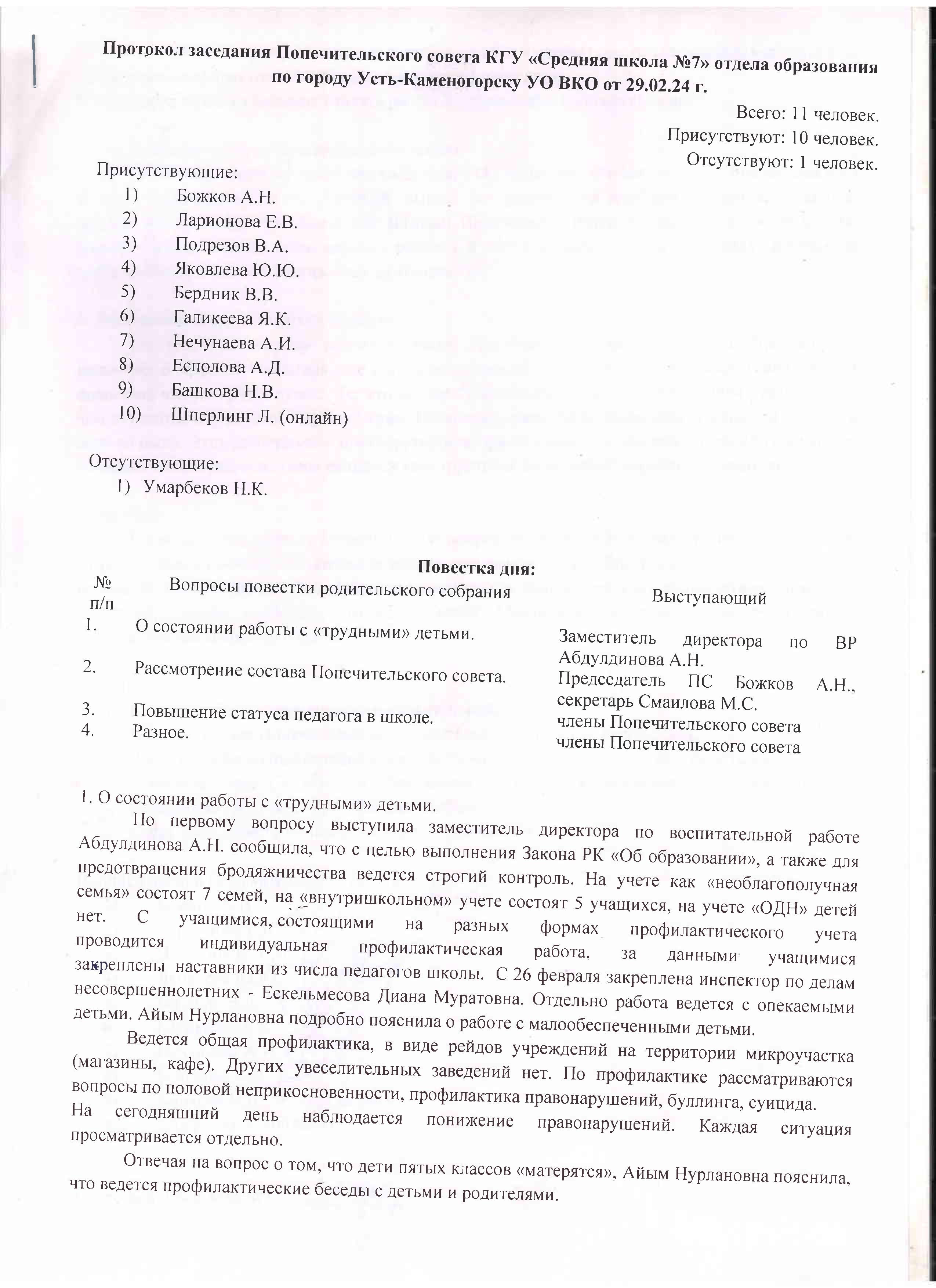 Заседание Попечительского совета от 29.02.2024г. » №7 орта мектебі