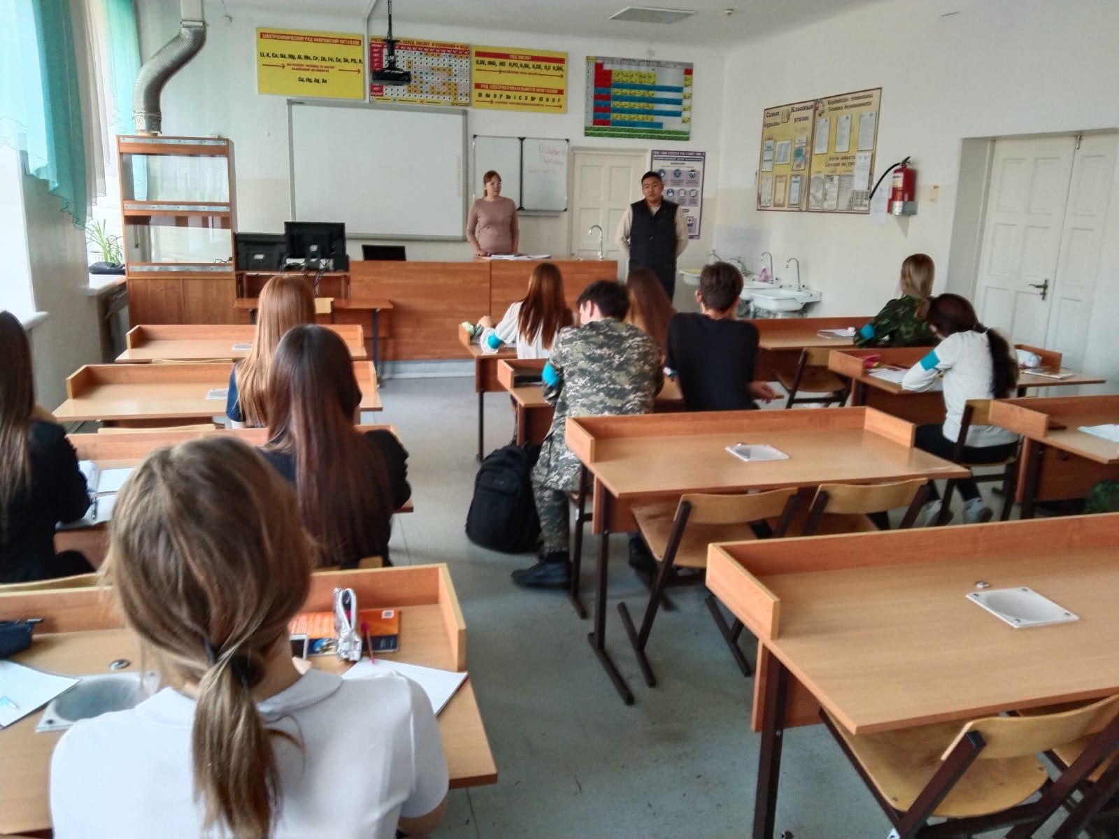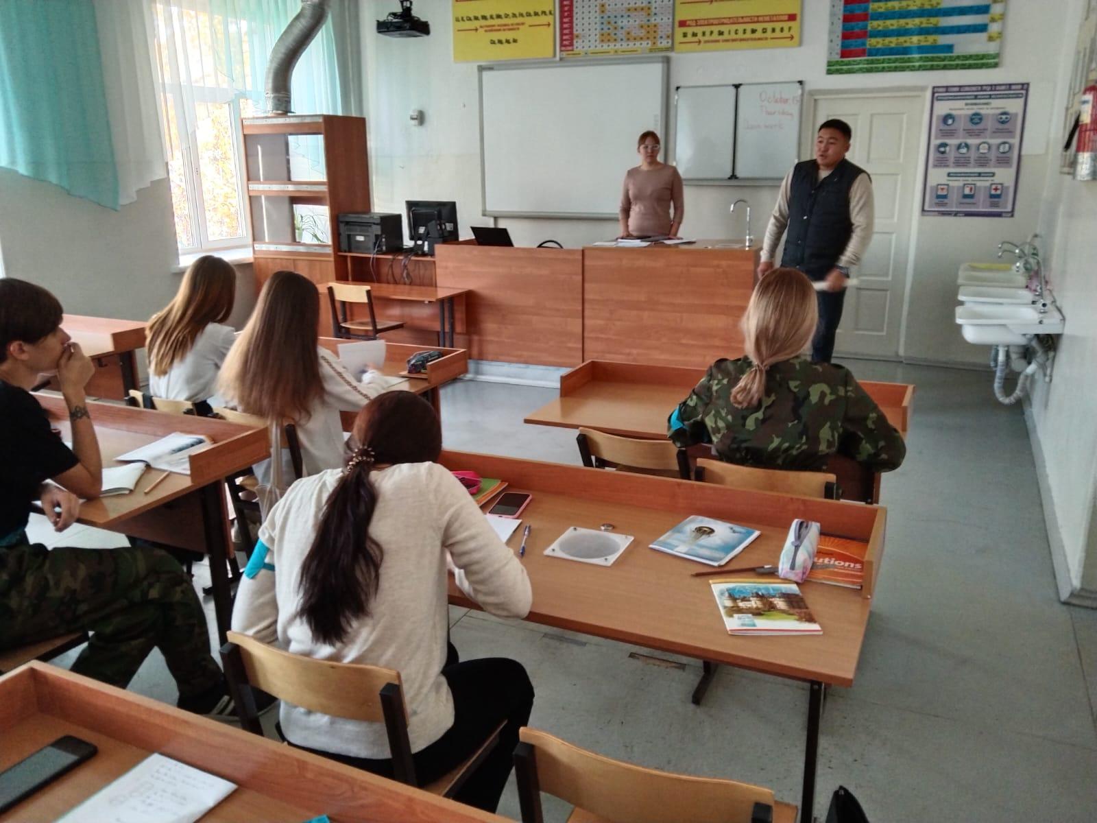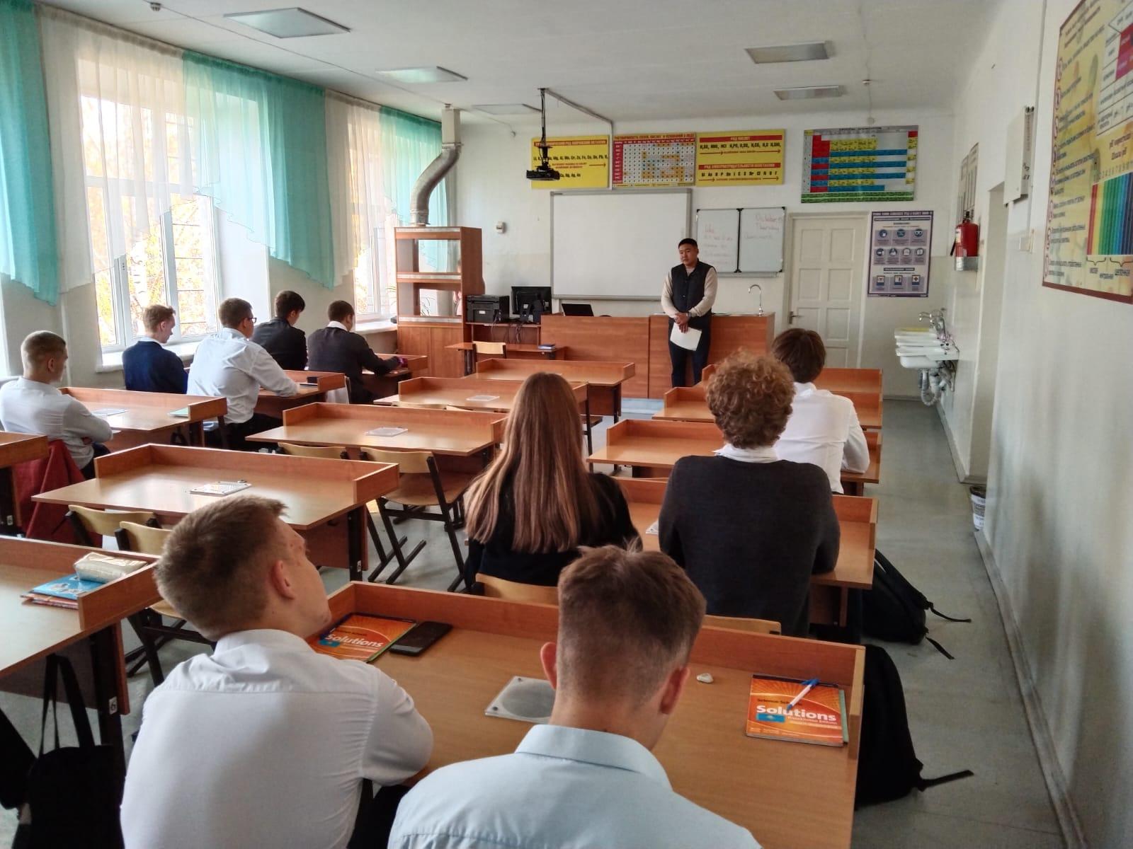 Ученикам была проведена профориентационная работа. Была предоставлена информация о Московском высшем военном училище, а так же Омском училище радиосвязи. Были предоставлены наглядные пособия о данных учебных заведениях. Представитель ПС КНБ РК ученикам 11 классов подробно разъяснил порядок поступления в данные ВУЗы и приоритеты обучения в данных учебных заведениях.