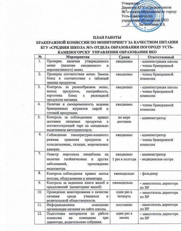План работы бракеражной комиссии » №7 орта мектебі