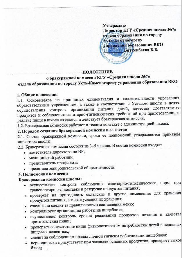 Положение о бракеражной комисии » №7 орта мектебі